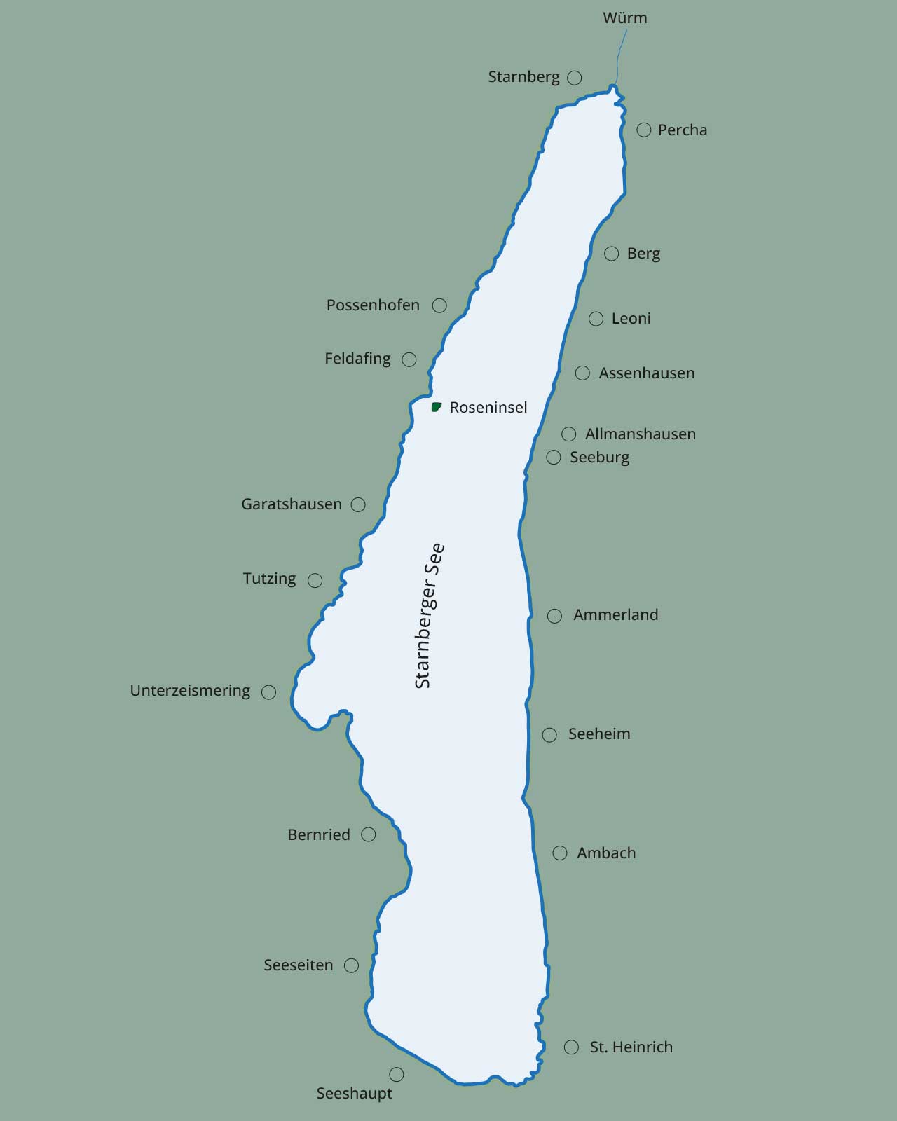 Vor dem westlichen Ufer, südlich von Possenhofen liegt eine kleine Insel, die Roseninsel. Bekannt geworden ist der See auch durch den tragischen Tod König Ludwigs II. 1886 in Berg. Daran erinnern noch heute die Votivkapelle und ein Holzkreuz im See.